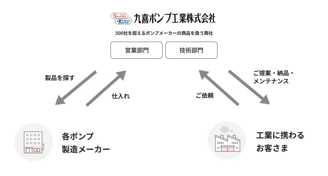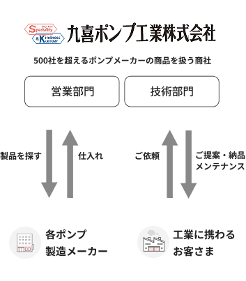 九喜ポンプ工業は一部自社製品もありますが、各仕入先様の商品を販売させていただく商社機能が大部分を占めています。